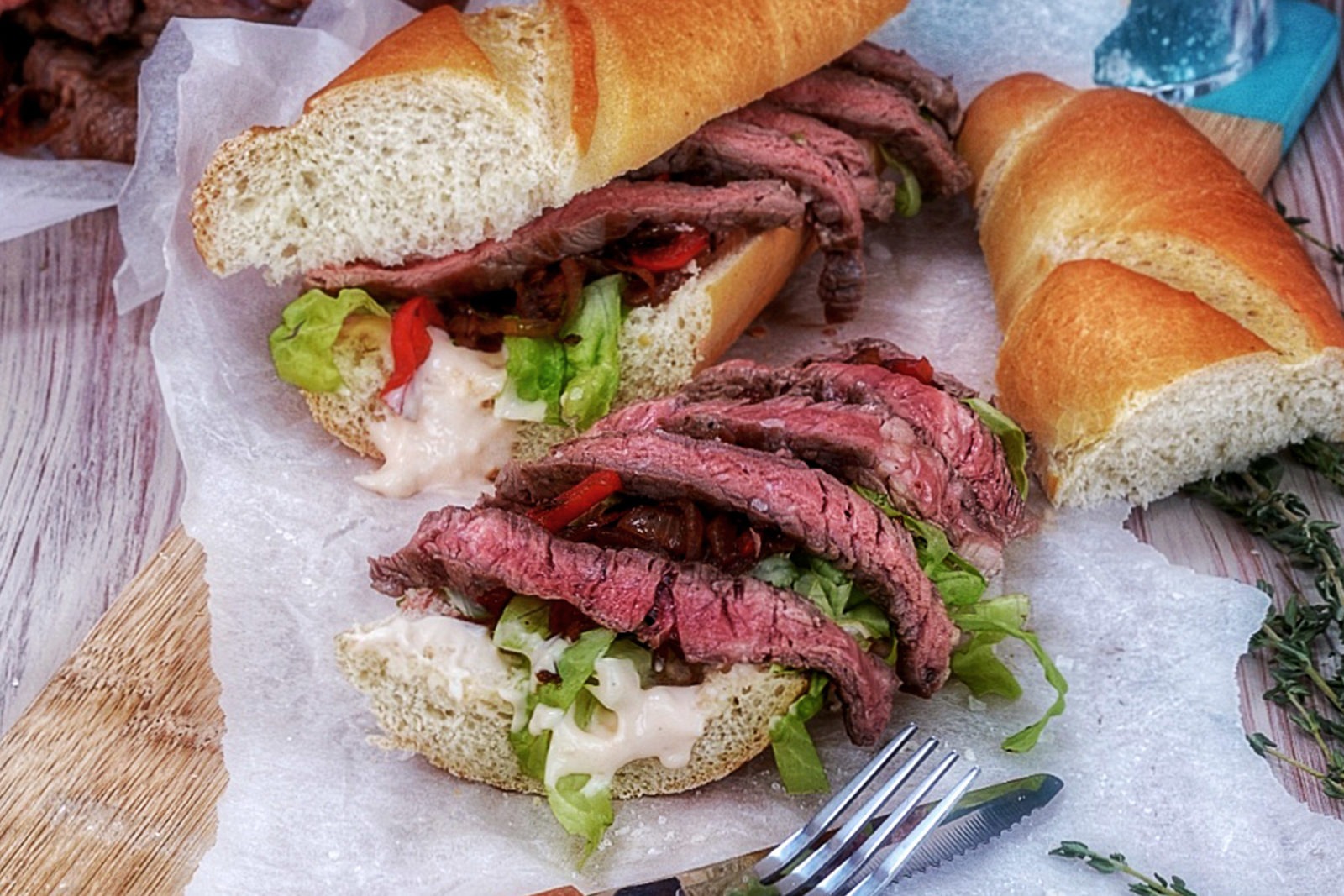 To assemble the steak sandwich: Place the baguette on a flat work surface and slice it in half lengthwise. Spread the inside of the bottom half of each with 1 tbsp of the chilli garlic mayonnaise. Then add a layer of lettuce followed by a tbsp of the onions and peppers mix spread out over the lettuce. Then add the sliced steak over the top of the filling next put on the top half of the sandwich, slice in half and continue the process with the rest of the ingredients until the assembly is complete. Serve and enjoy.