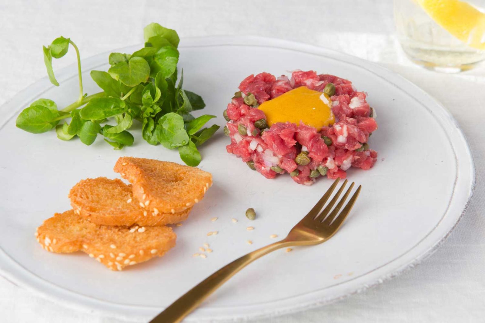 This Hereford steak dish is “tartare au couteau ” which means prepared with a knife. It is the simplest of recipes but its success relies on excellent ingredients. The Espelette pepper is grown in the French commune of Espetette, Pyrenees-Atlantiques, traditionally the northern territory of the Basque people. However if unavailable it can be replaced with black pepper.